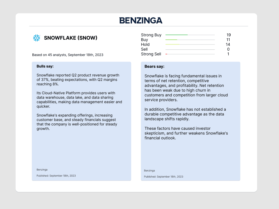 Integrate with the Benzinga Analyst Ratings API to access comprehensive data, including ratings, price targets, and consensus opinions, alongside Bulls Say / Bears Say summaries for the full Analyst Ratings experience.
