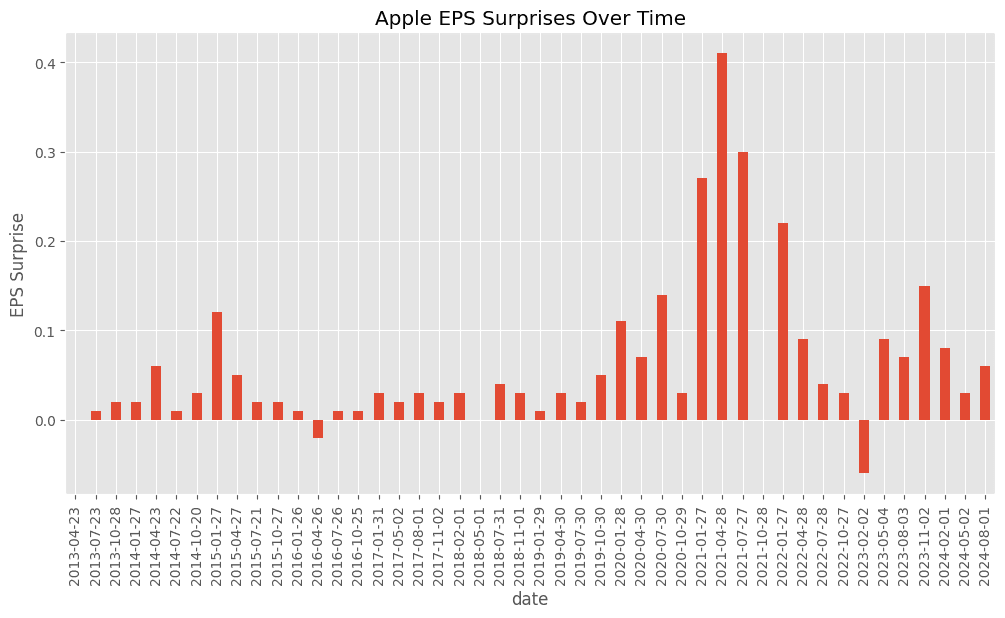 We filter out empty values from the eps_surprise column and convert the data to float. Using Matplotlib, we plot the EPS surprises in a bar chart, providing a visual representation of how Apple’s reported earnings have compared to market expectations over time.