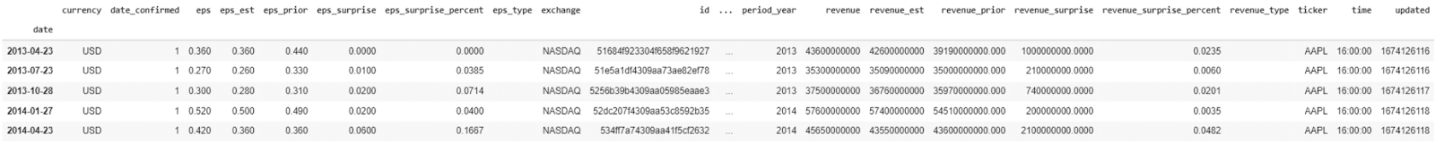 Now that we’ve authenticated the API key, let’s move on to extracting the earnings data for Apple Inc. (AAPL). The code below requests the earnings data from Benzinga’s Earnings API and formats it as a Pandas DataFrame for further analysis.