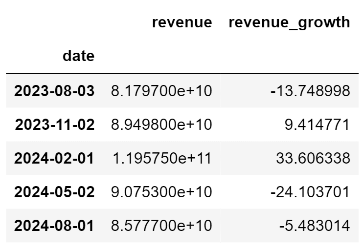 Here, we extract the revenue data, convert it to a float type (since financial data is numeric), and calculate the percentage change in revenue using the pct_change() method. The revenue growth is expressed as a percentage. The results are stored in a new DataFrame, allowing us to track Apple’s revenue growth over time.