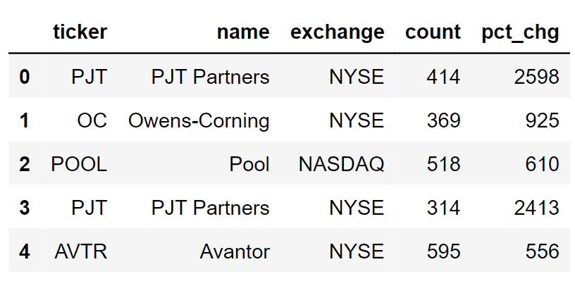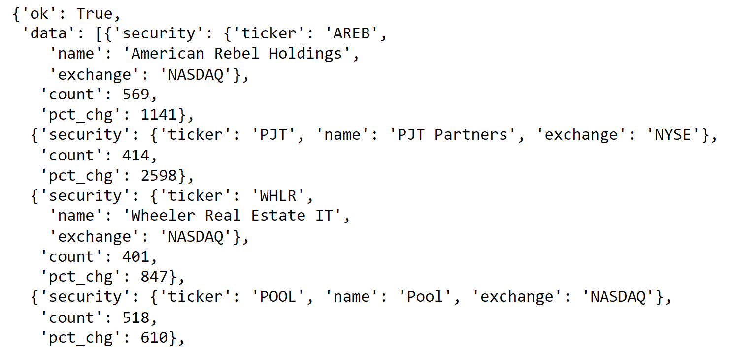 Data extraction: The JSON response is converted into a Pandas DataFrame for easier manipulation. The ‘security’ field, which contains the ticker, name, and exchange information, is normalized into separate columns using pd.json_normalize(). The count of mentions (count) and the percentage change (pct_chg) are also extracted and added to the DataFrame.