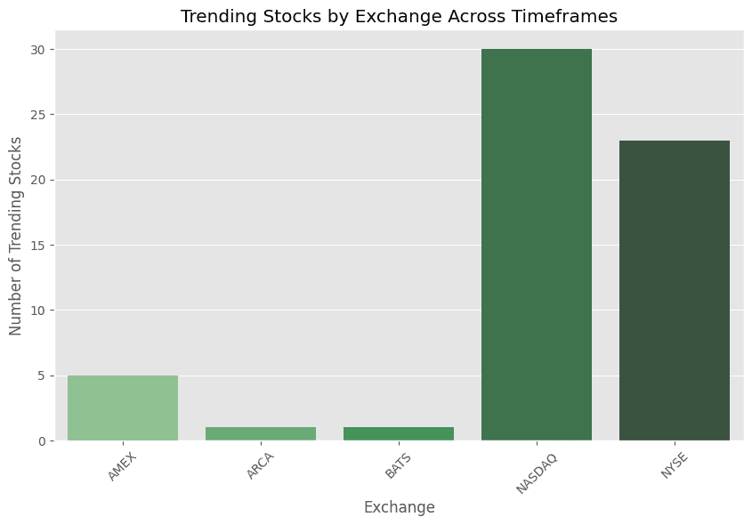 In this analysis, we extract ticker and exchange information for different timeframes and aggregate it to count the number of trending stocks per exchange. This is then visualized in a bar plot.