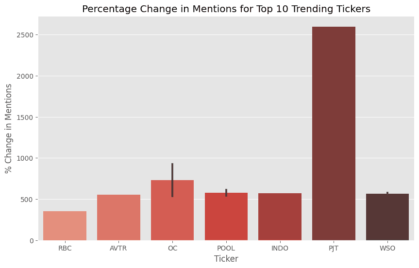 Next, we will analyze the percentage change in mentions for the top 10 trending tickers. This metric can highlight stocks experiencing a sudden surge in attention, indicating a potential shift in market sentiment.