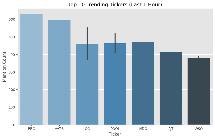 The percentage change in mentions (pct_chg) is plotted for the top 10 trending tickers. This chart helps us identify stocks that have seen the largest relative increases in the number of mentions over the specified timeframe.