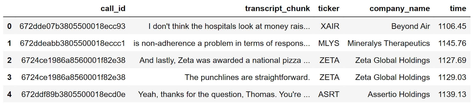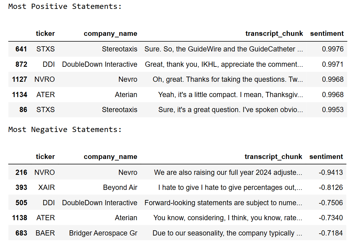 To gain more specific insights, we can identify the individual transcript chunks with the highest and lowest sentiment scores. These excerpts often represent key moments in the conference calls where particularly positive or negative information was shared.