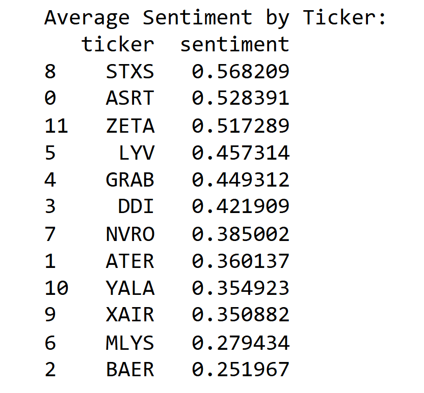 The average_sentiment DataFrame provides a sorted list of tickers with their average sentiment scores, helping us to quickly identify companies with generally positive or negative sentiment in their conference call transcript chunks. This is the output of the code: